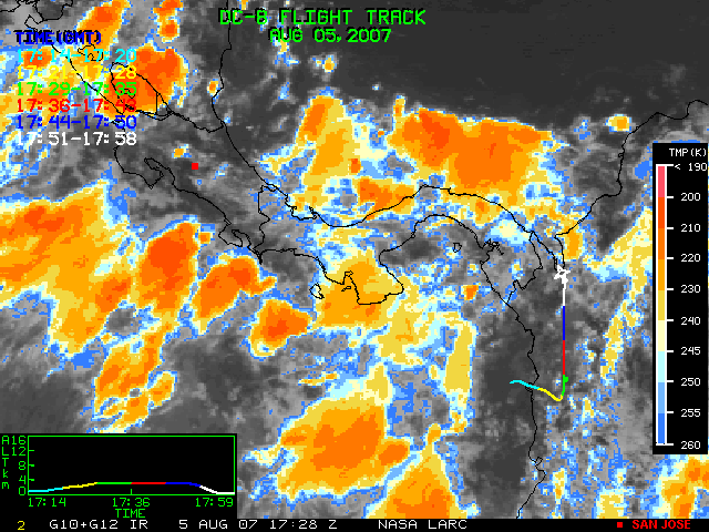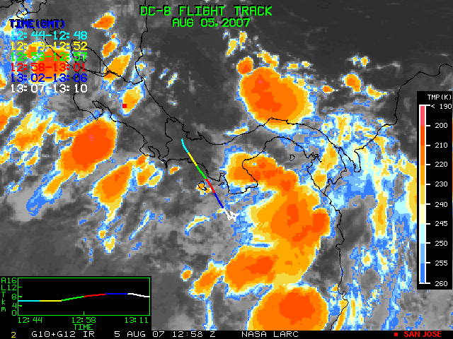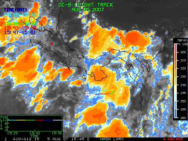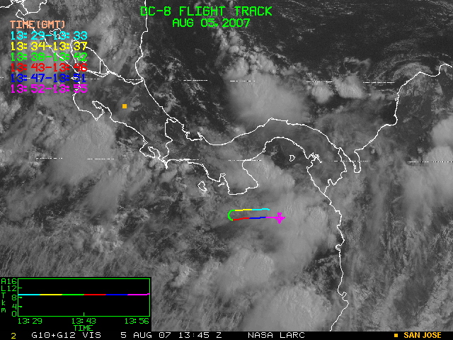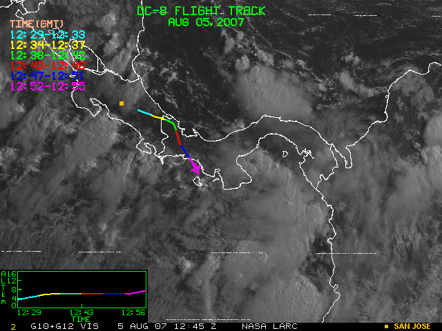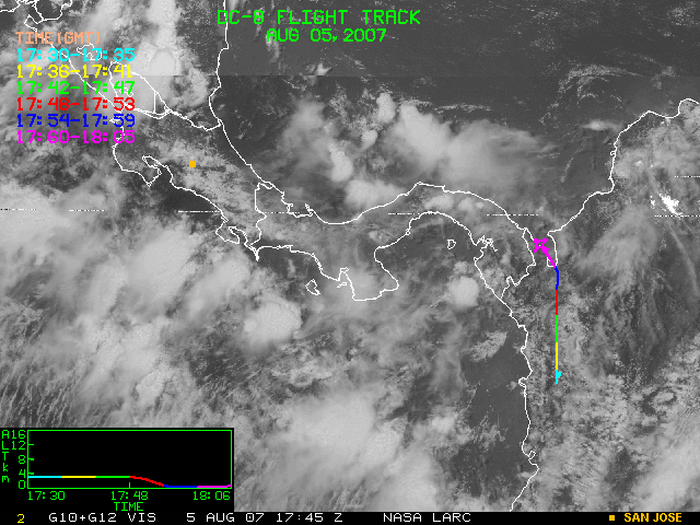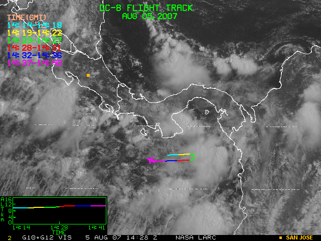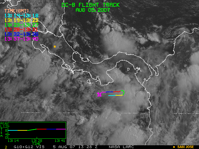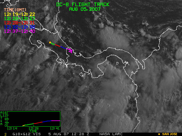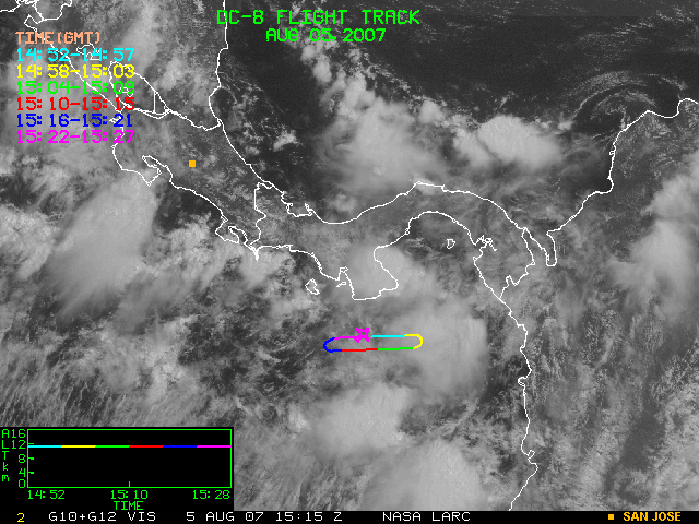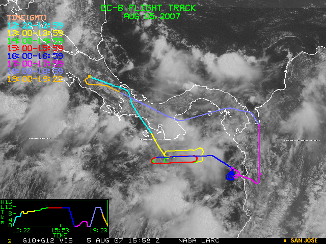 GOES (G10+G12) Visible image (05 August 2007 15:58 UTC) showing DC8 flight track