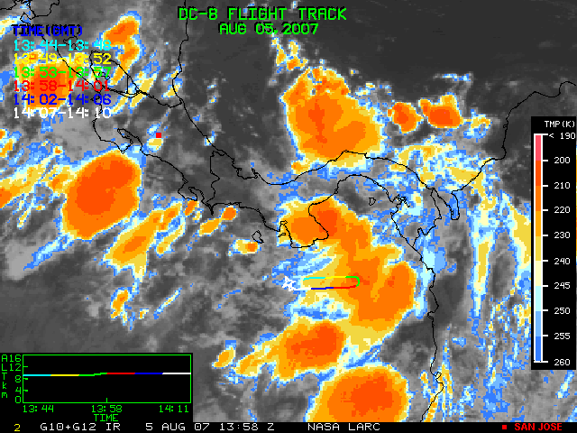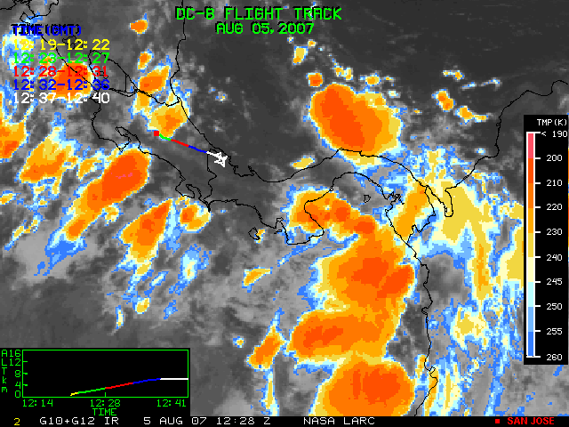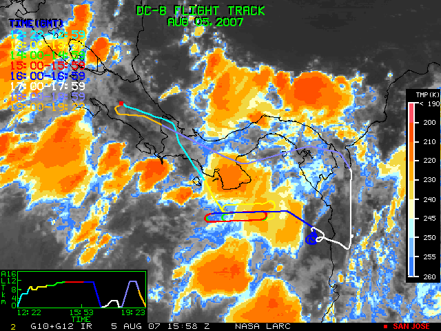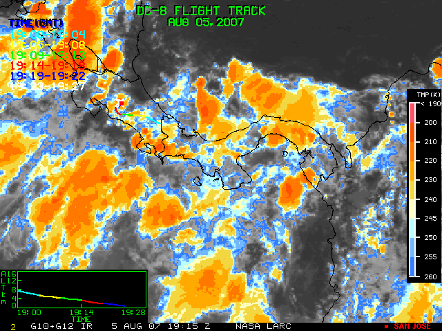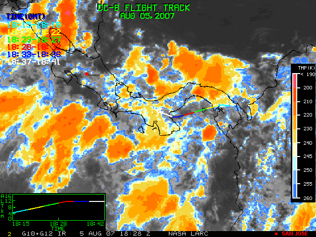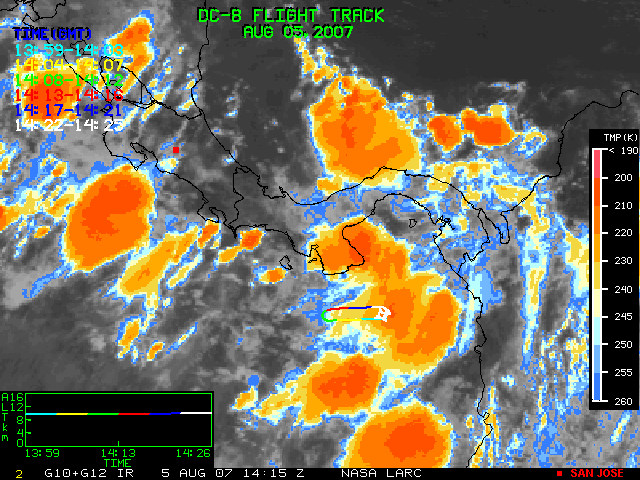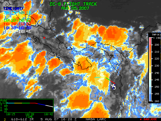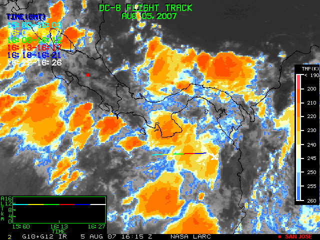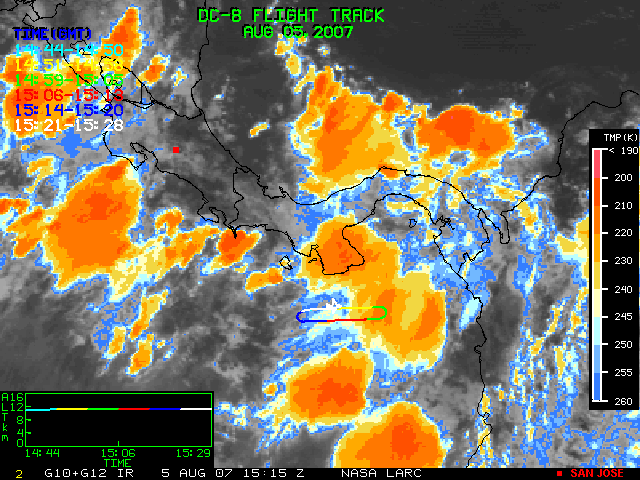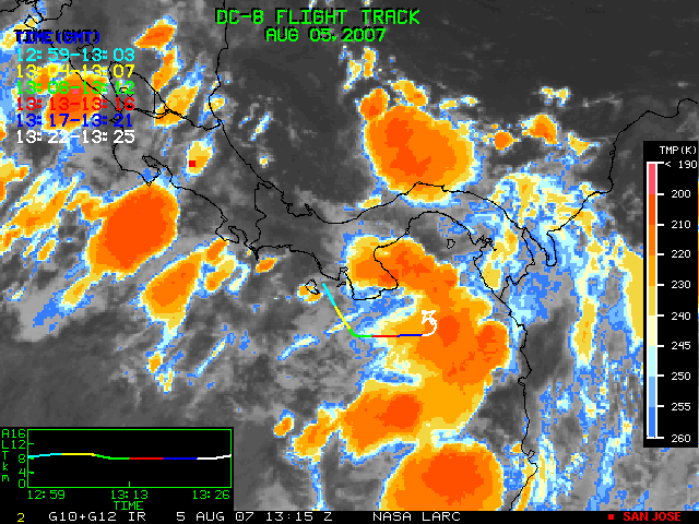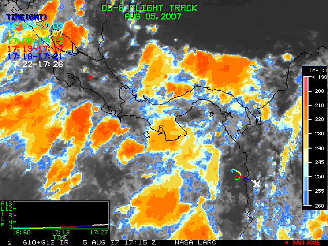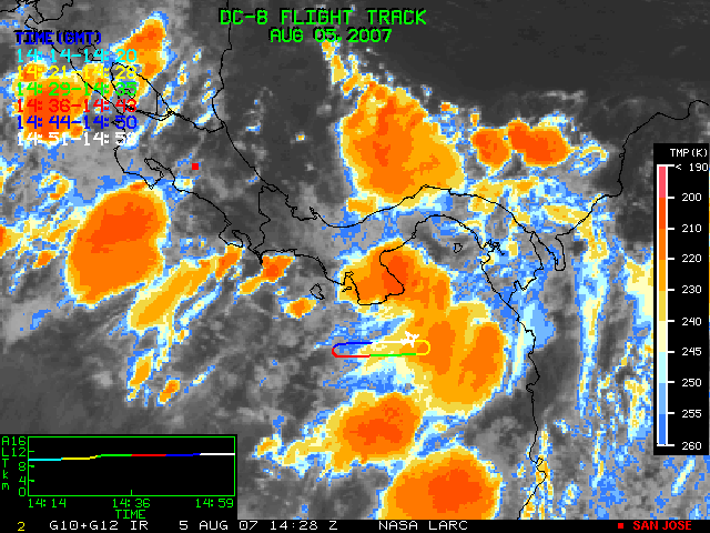 GOES (G10+G12) Visible image (05 August 2007 15:58 UTC) showing DC8 flight track