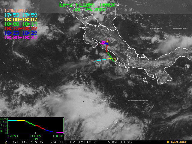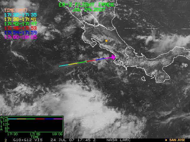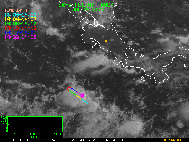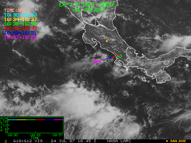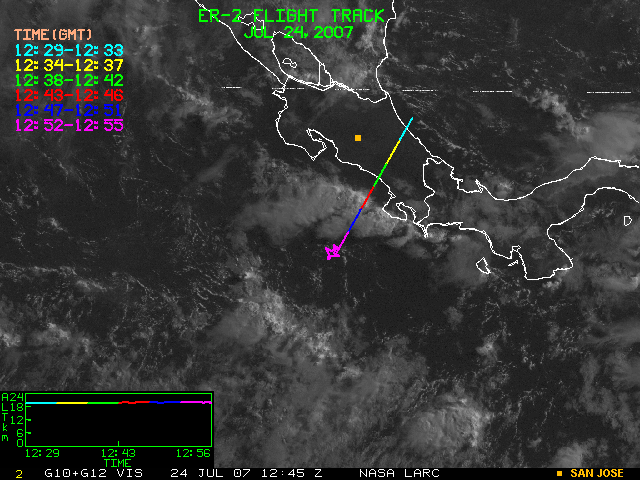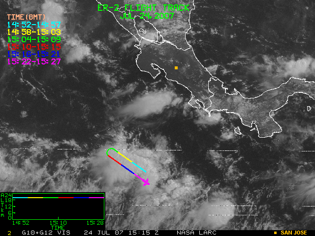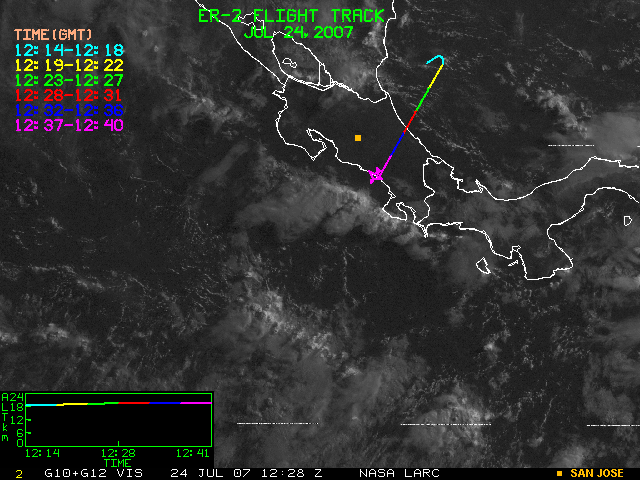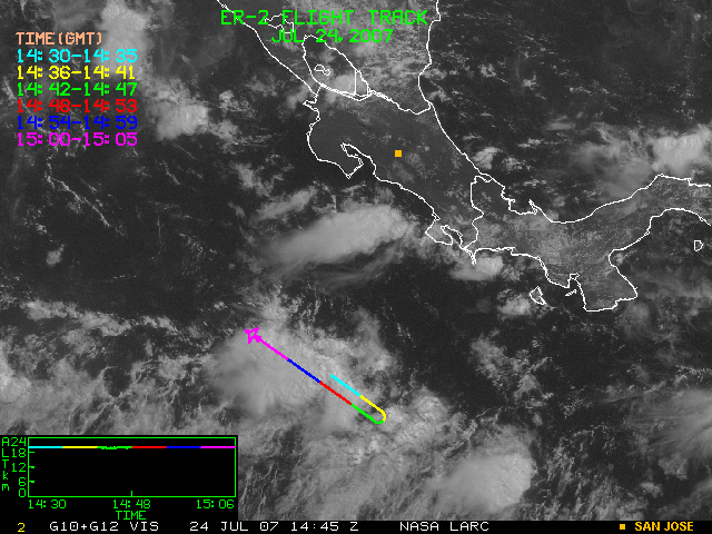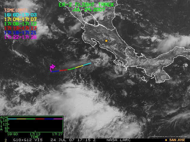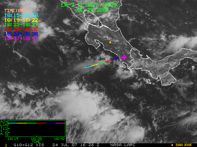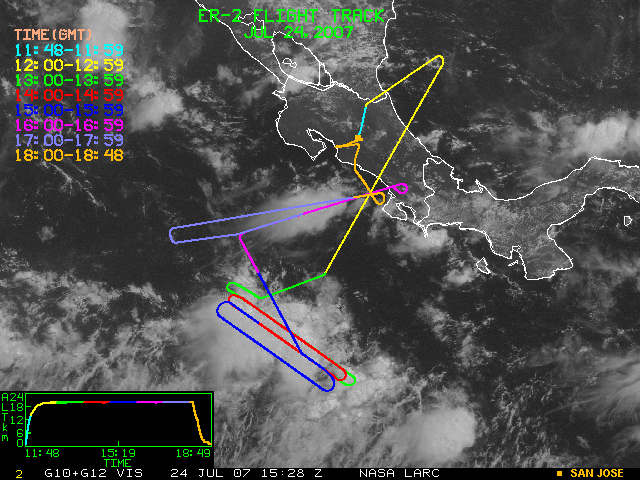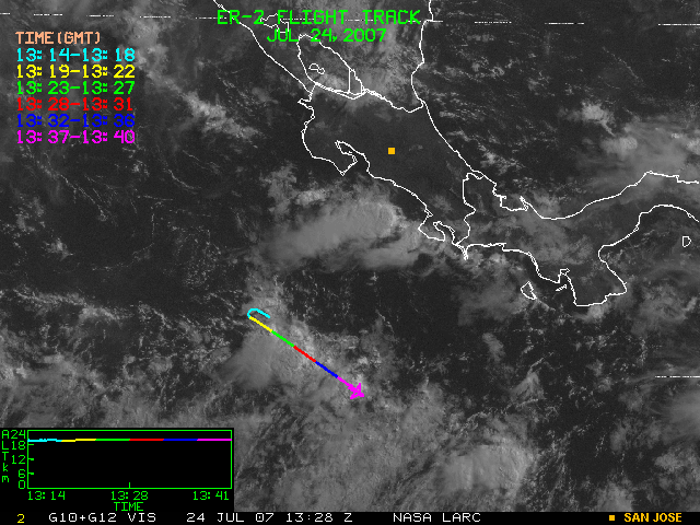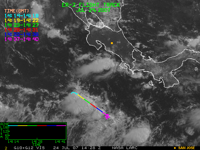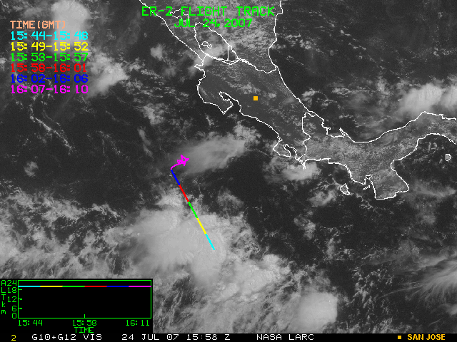 GOES (G10+G12) Visible image (24 July 2007 15:28 UTC) showing ER2 flight track