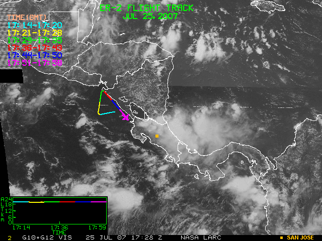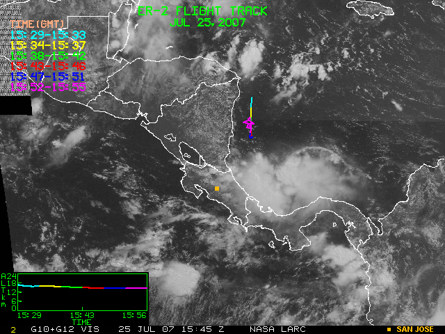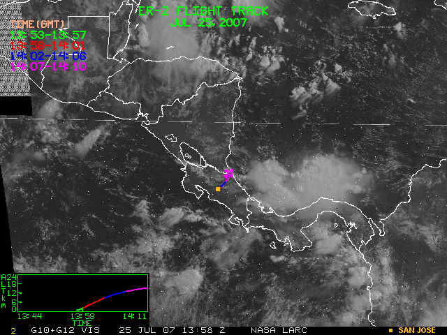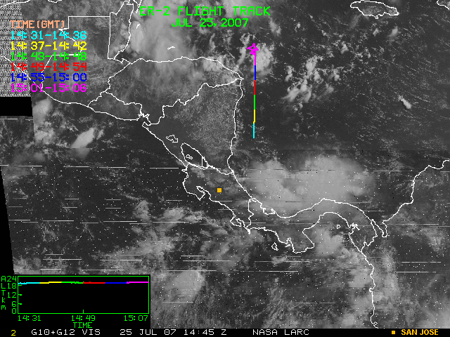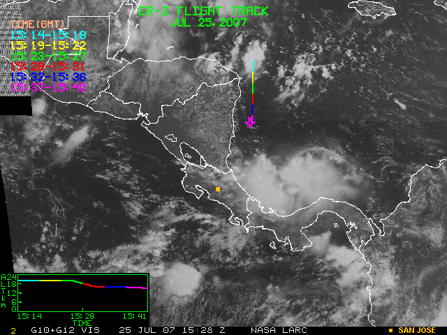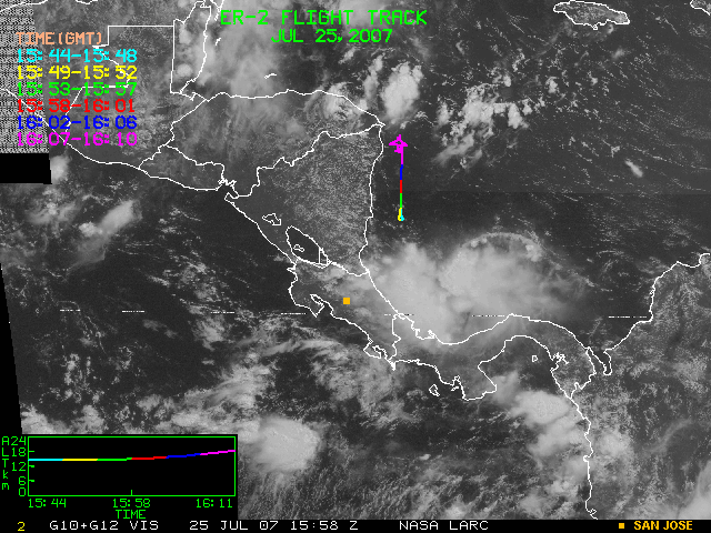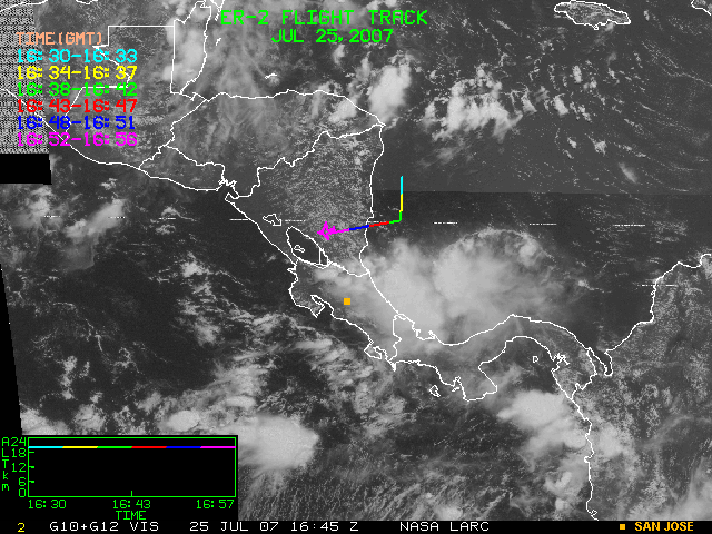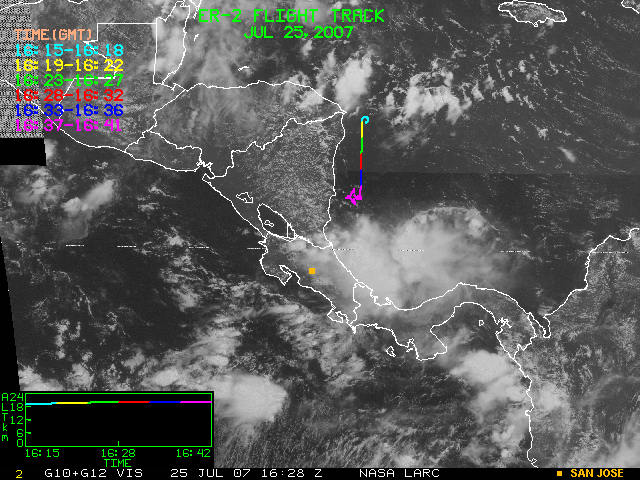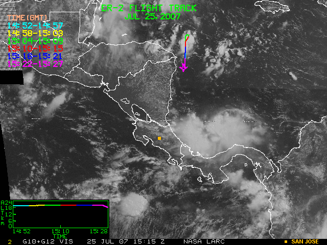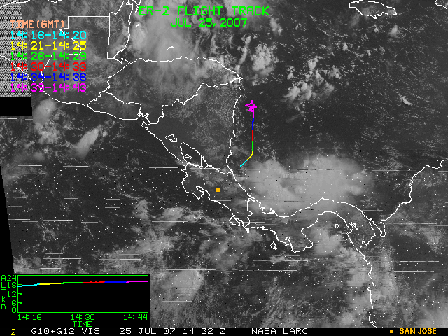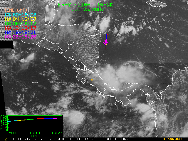 GOES (G10+G12) Visible image (25 July 2007 16:28 UTC) showing ER2 flight track