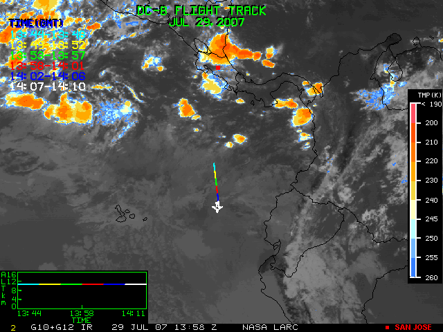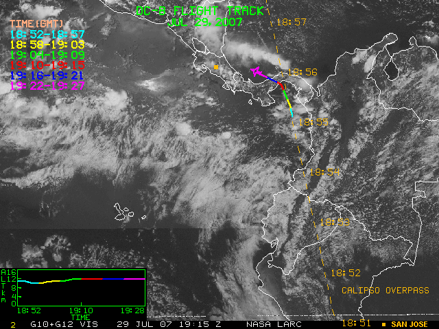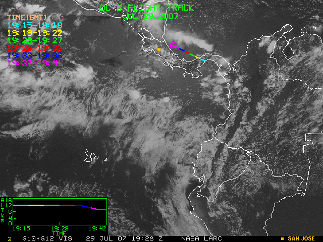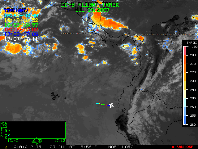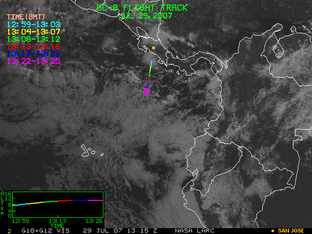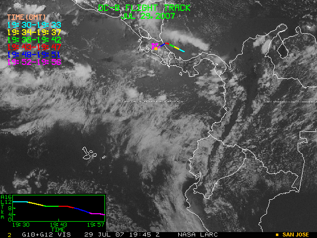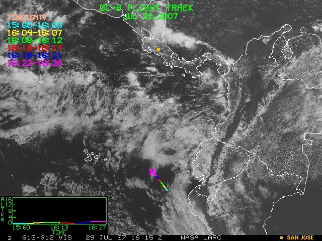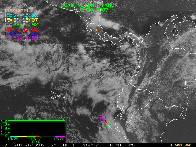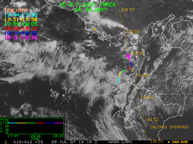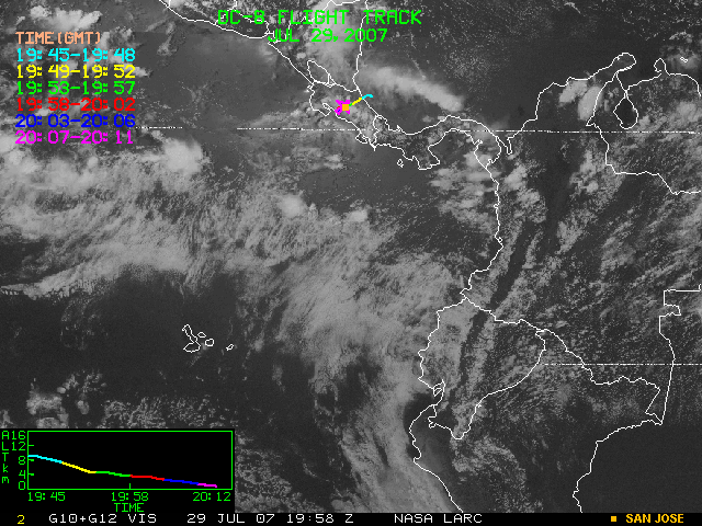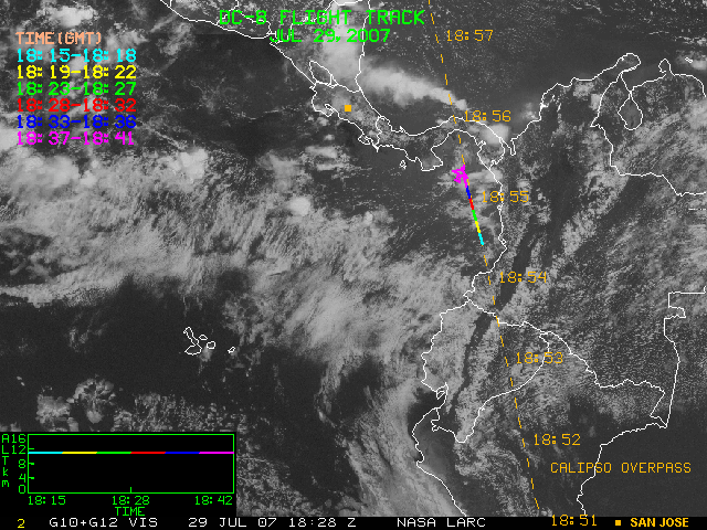GOES (G10+G12) Visible image (29 July 2007 16:28 UTC) showing DC8 flight track